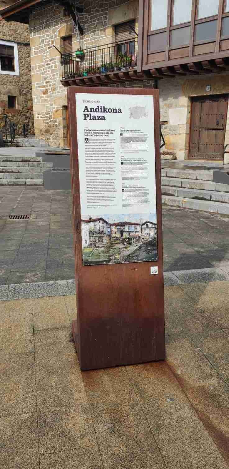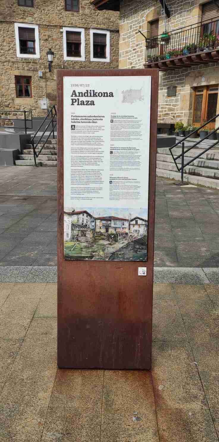 Y es que el tiempo, precisamente, es el protagonista en esta plaza. El 22 de julio de 1936 , cuatro días después del golpe de Estado que desencadenó la Guerra Civil, dos bombarderos ligeros arrasaron el centro de Otxandio. El principal escenario de la tragedia fue la Plaza Andikona, donde murieron al menos 61 personas —civiles, milicianos, niños— en lo que se considera el primer ataque aéreo sobre la población civil de la contienda. Una herida que Otxandio lleva en su memoria colectiva desde entonces.