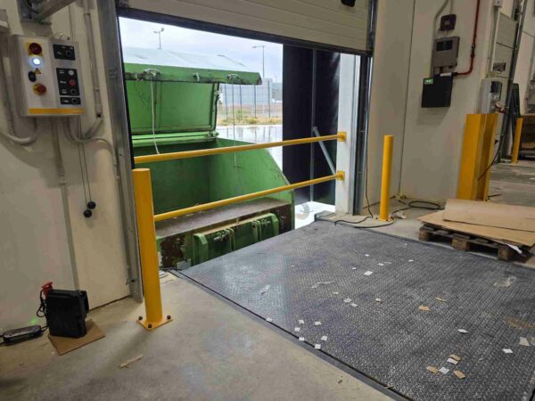 Otra de las especialidades de la empresa son las barreras antivuelco y barandillas metálicas que se instalan en muelles de carga, bocas de compactadores o zonas con desnivel, como se aprecia en las defensas amarillas que delimitan la rampa frente al contenedor. Estas estructuras forman un perímetro físico que disuade el acceso involuntario y evita caídas de personas o vehículos, convirtiendo puntos negros de la operativa diaria en áreas controladas y seguras. La combinación de postes anclados al suelo y travesaños horizontales crea un sistema modular que Curmi adapta en altura y longitud según las necesidades de cada puerta o plataforma.